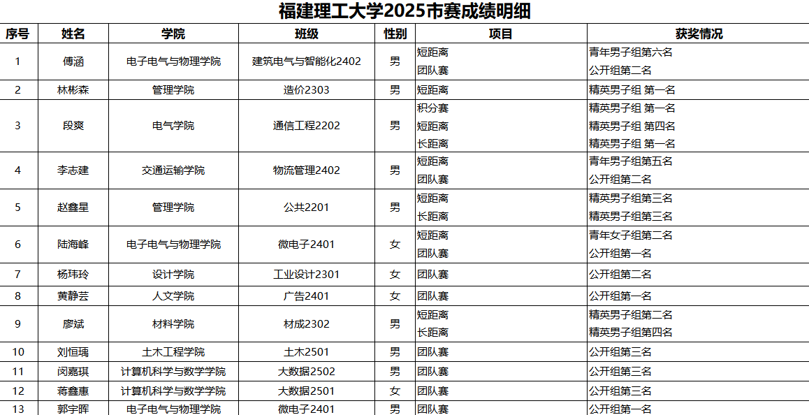 11月1日至2日,由福州市体育局主办的第十四届福州市定向越野公开赛在永泰县举行。本次赛事吸引了千余名选手踊跃参与,校定向越野队在教练林赤水指导下奋勇争先,斩获多项佳绩。 个人短距离项目中,林彬森荣获精英男子组冠军,陆海峰摘得青年女子组亚军,廖斌则斩获精英男子组亚军。团队赛中,由陆海峰、黄静芸、郭宇晖组成的团队勇夺公开组第一名,傅涵、李志建团队获得第二名,杨玮玲、刘恒瑀团队则荣获第三名。此外,段爽在积分赛和长距离项目中均摘得精英男子组冠军。此次佳绩是教练精心指导与队员顽强拼搏的结果,校定向越野队将秉持不懈努力的精神,力争在未来的赛事中再创佳绩。 撰 稿:陈志宇 初 审:林赤水 终 审:梁建锋 系统审核:潘帅